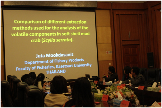 研讨会由牟海津副院长主持。首先,薛长湖院长介绍了我院的教学与科研情况,Suriyan Tunkijjanukij 院长介绍了泰国来访的教师和农业部官员。随后,泰国农业部水产部门官员Supakant Chaichotranunt先生作了题为:“泰国糙海参的养殖与繁育”的报告,海燕论坛 唐庆娟副教授作了题为:“海参活性成分与加工技术”的报告,泰国农业大学水产海燕论坛 教师Juta Mookdasanit 博士作了题为:“不同提取方法对锯缘青蟹挥发性成分检测的影响比较”的报告。此次“中-泰”国际合作项目研讨会主要围绕海参的养殖及加工技术展开,整场研讨会气氛高涨,参会人员讨论热烈,食品海燕论坛 师生均表示受益良多。此次研讨会为双方进一步深入交流与合作夯实了基础。(文/唐庆娟;图/武娟)