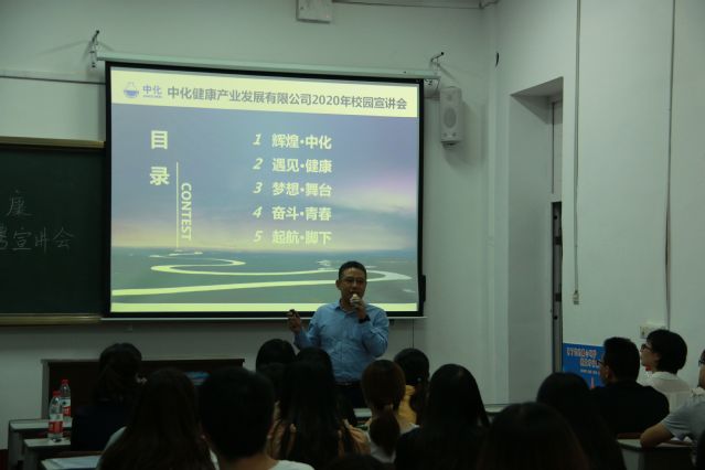 为切实做好毕业生就业工作,大力构建毕业生与用人单位的交流平台,积极为用人单位输送应用型人才,中化健康产业发展有限公司于2019年9月23日晚18:30在新教学楼0105教室举办2020届毕业生专场招聘宣讲会。