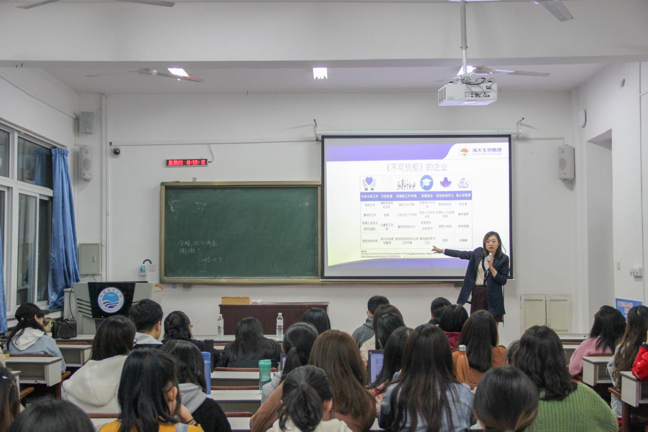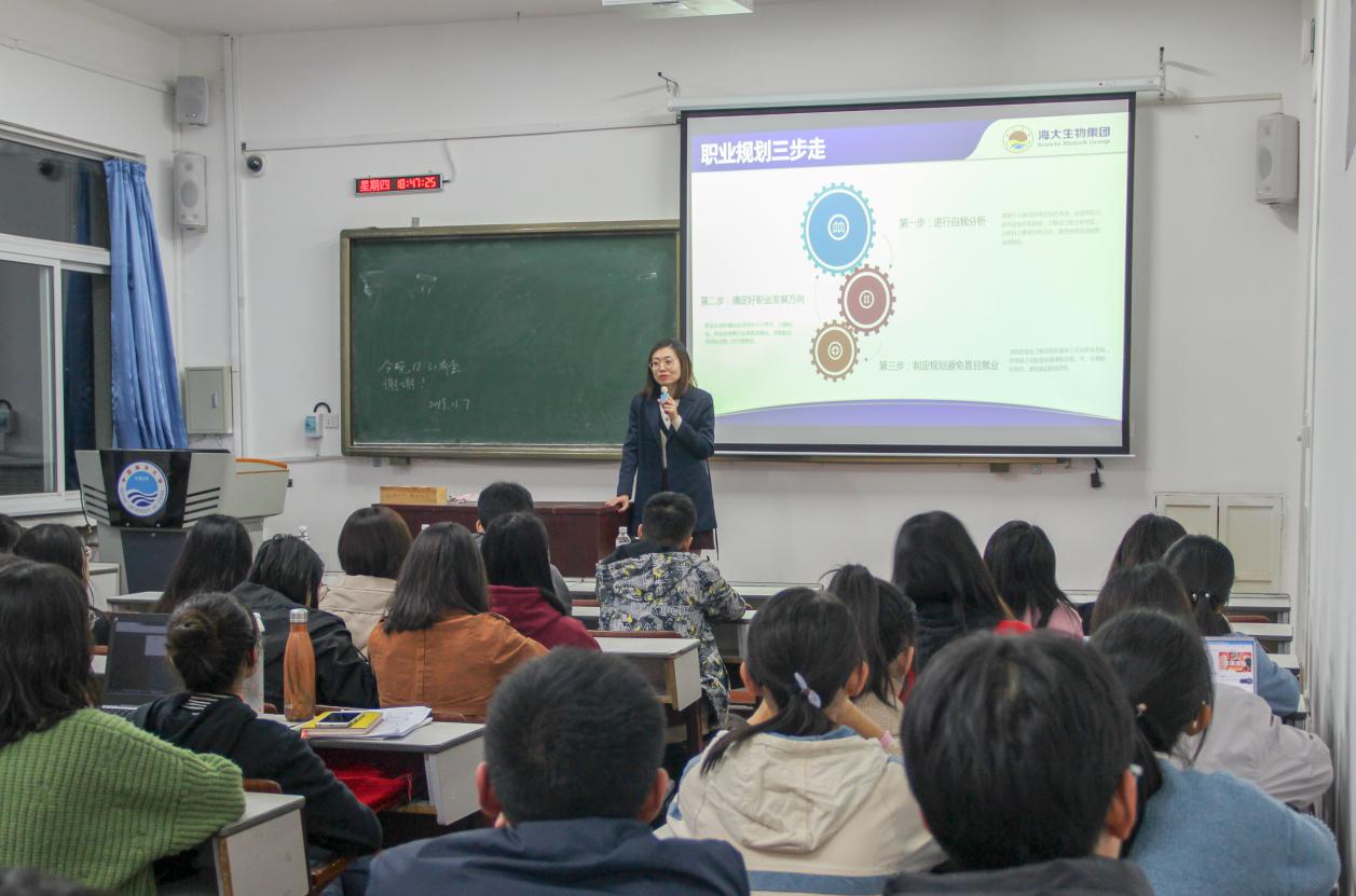 为推进大学生就业指导工作,明确大学生就业目标,2019年11月7日晚,海燕论坛 学生会在鱼山校区新教学楼举办了“就业指导月系列活动:名企名家-职业规划讲座”活动。此次活动邀请到了青岛海大生物集团人力资源总监张晶蓓女士参加本次讲座。