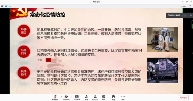 之后,李春君和庞甲雷同志对于疫情的常态化防控以及推进复学复工复产过程中应该注意的问题进行了分享。李春君同志着重介绍了疫情常态化防控的重要性和必要性,并详细介绍了社区防控,商场防控,学校防控和个人防控的不同防控措施,此外,他还非常详细地讲解了什么情况下需要戴口罩,如何正确戴口罩;庞甲雷同志则主要分享了学生返校途中为了防止感染疫情的应该采取的做法,两位同志的精心分享引起了大家对于疫情防控不放松的重视。