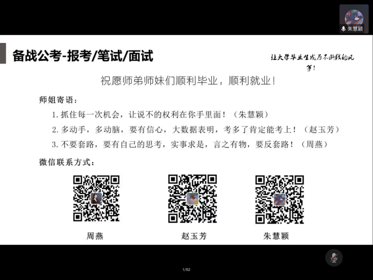 赵玉芳师姐(山东):介绍了各个考试笔试的时间、内容(国考、选调、其他类型)。师姐认为平时可以通过学习强国、公众号等途径积累综合知识的学习。最后提了3点备考建议:可先按国考准备、资料准备(网课、报班、APP(中公、华图、粉笔)、新媒体等)、学习步骤(听课、刷题、总结)。