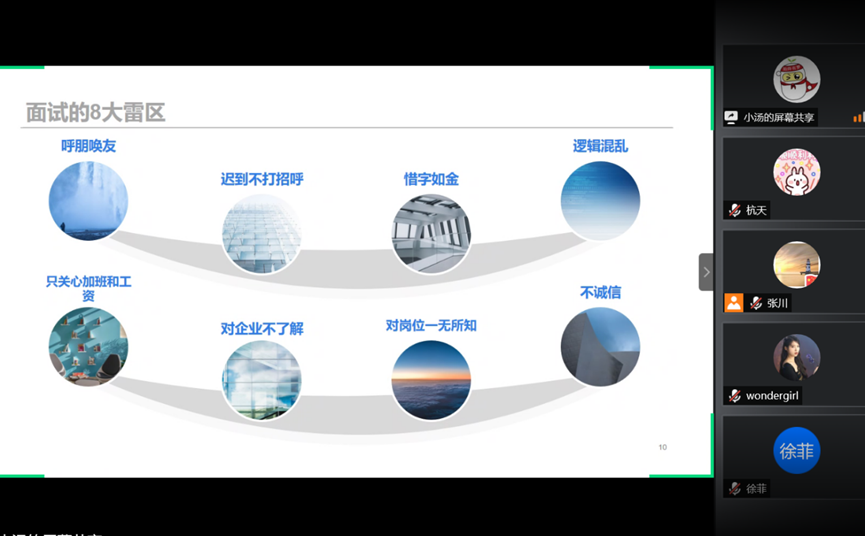 汤臣倍健的周经理从简历和面试两个大方面给同学们进行了分享,主要包括简历的制作要点、内容、投递的小技巧,以及面试中的一些注意事项。最后,周经理总结了求职者在面试过程中遇到的八大雷区。