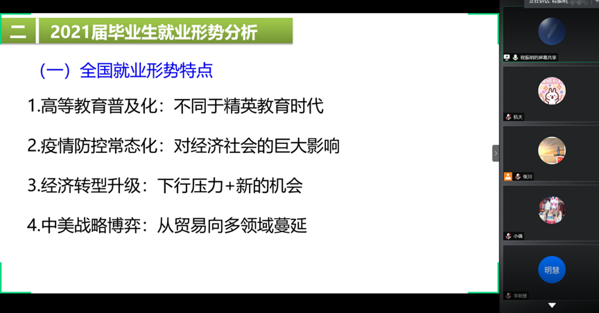 程振明展示了近两年毕业生的就业数据,近几年的就业率逐渐下降,也表明了近几年就业形势较为紧张。同时,根据往年的就业数据以及当前的具体情况,提出2021届毕业生就业形势特点。