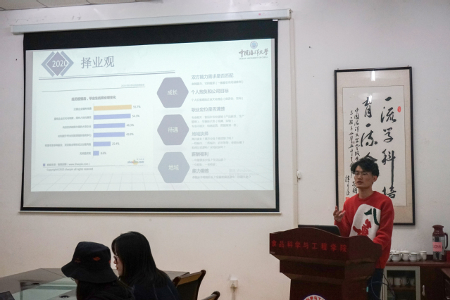 首先,已经拿到美的、格力、恰恰食品等企业offer的邓小飞同学从个人成长、薪资待遇、地域发展等方面介绍了自己的择业观,并强调个人能力要与求职岗位相匹配。受今年疫情大环境的影响,毕业生择业观发生较大改变,更多毕业生开始注重企业福利待遇与企业制度,明确自身需求是求职的基础。随后,邓小飞从简历制作、求职信息获取、面试准备、求职技巧等方面分享自己的求职过程和经验,并依次提出自己的建议。在经历海投、被拒、面试、终面后,通过不断地尝试,逐步掌握面试技巧,并找到心仪的工作。最后,针对面试中常遇到的问题和题目进行介绍和分析,并给出自己的建议。