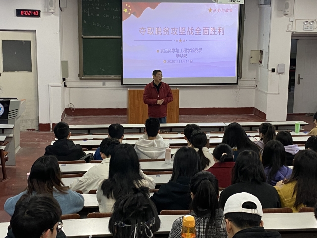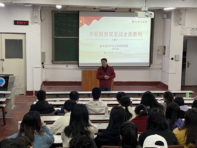 本站讯 11月14日上午,海燕论坛 党委书记辛华龙以《夺取脱贫攻坚战全面胜利》为题为本科生上形势与政策课。海燕论坛 专职辅导员张川、吴佩伦旁听了课程。