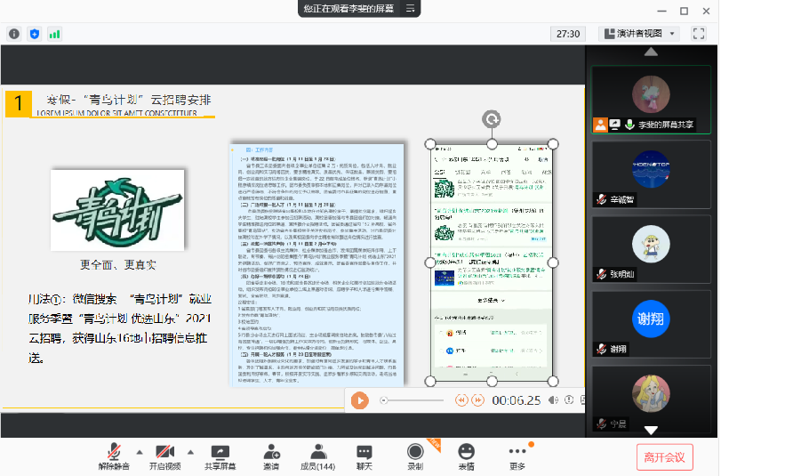 随后,李斐着重介绍寒假期间招聘会安排以及签约手续的相关内容。为助力2021届毕业生充分高质量就业,李斐对我校首次举办的“中国海洋大学2021届毕业生寒假空中双选会”参会方式以及目前的报名情况进行介绍和通报,并根据报名情况进行动员。此外,1月28日“青鸟计划 优选山东”2021云招聘活动即将拉开帷幕,李斐对岗位信息检索方式和简历投递方式进行详细介绍,并对前期工作和成效进行通报,助力提升“青鸟计划”服务中心大局能力。