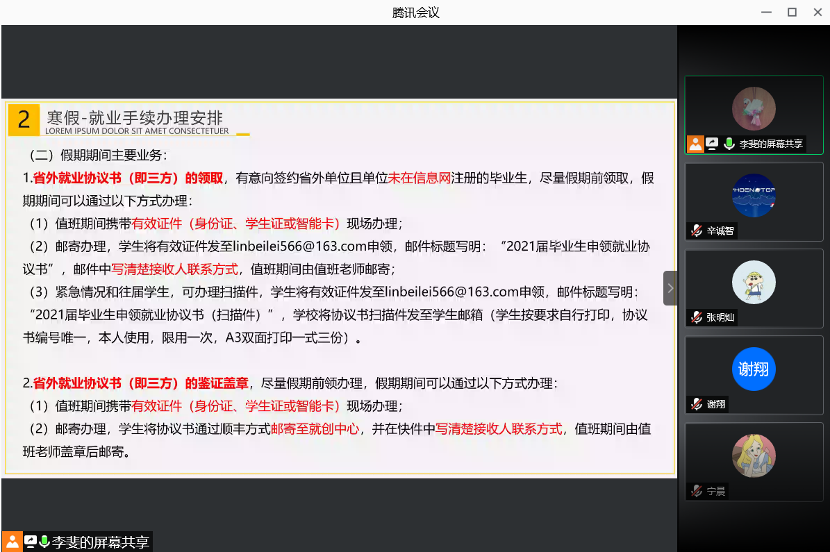 寒假期间海燕论坛 就业辅导员、学校就业创业指导与服务中心(就创中心,下同)将持续为毕业生提供签约指导和服务,就创中心采用“线上+线下”相结合的方式保障寒假期间就业手续途径畅通。紧接着,李斐对寒假期间就创中心值班时间和地点、就业协议的领取和鉴证盖章流程、解约手续办理注意事项等进行介绍。随后,李斐详细介绍省外用人单位签约的办理流程以及毕业后档案派遣去向等问题,帮助大家熟悉各种就业手续和政策,并强调诚信签约的重要性。此次会议,为同学们梳理了复杂的就业手续办理的流程,解答了同学们关于就业手续办理的诸多疑惑。