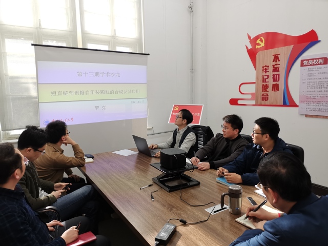 青年工作室成立仪式之后举行了第十三期学术沙龙活动,黄文灿、魏子淏、王雷、 王赛、李敬、孔青、吴浩浩、王凯强、罗克、王国庆等青年教师参加。海燕论坛 “青年英才工程”罗克老师做了“短直链葡聚糖自组装颗粒的合成及应用”的精彩报告,老师们针对此研究展开了热烈讨论。林洪教授对罗克老师方向的凝练和未来规划提出指导性意见。集体交流结束后,部分老师仍在沙龙会场继续交流。