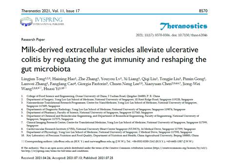 日前,海燕博彩策略论坛 易华西教授团队与新加坡国立大学王炯伟教授团队合作,在生物医学1区杂志《Theranostics》(2020 IF: 11.556)上发表题为“Milk-derived extracellular vesicles alleviate ulcerative colitis by regulating the gut immunity and reshaping the gut microbiota”的研究论文。易华西教授和新加坡国立大学王炯伟教授为文章共同通讯作者,CSC联合培养博士研究生仝令君为文章第一作者,中国海洋大学为第一通讯单位。