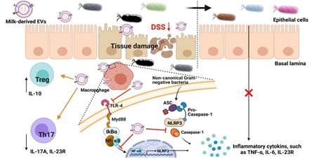 炎症性肠病(IBD)是全球性的健康问题,常伴随着肠道免疫稳态紊乱以及肠道菌群失调。免疫抑制药物是目前IBD的主要治疗方法,但药物治疗过程中可能引起骨髓抑制、便秘、嗜睡等副作用,对宿主肠道菌群也有一定的负面影响。目前没有理想的IBD治疗药物。基于调节肠道免疫和靶向肠道菌群的特殊膳食补充剂是目前预防、缓解或治疗IBD的研究热点。本研究报道了牛乳来源的天然纳米细胞外囊泡(mEVs)对结肠炎症的缓解和保护作用,揭示了其通过调节宿主肠道免疫稳态和肠道微生物的作用机制,证明了mEVs作为一种潜在的肠道稳态调节剂在预防和治疗IBD中的作用。