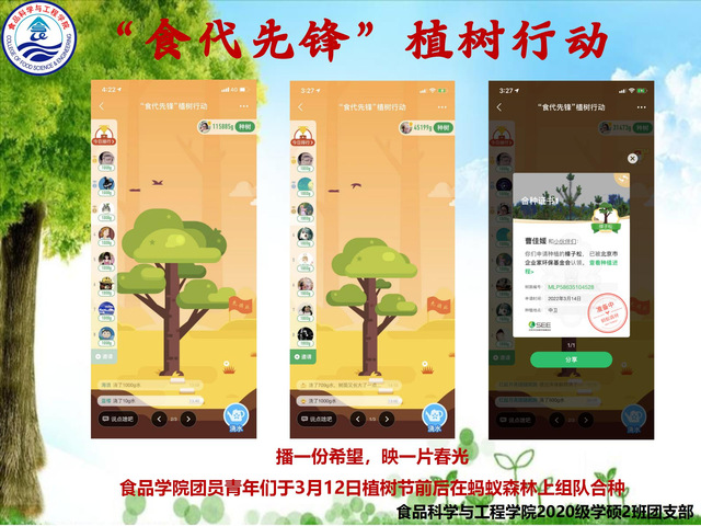 本站讯 阳春三月,第44个植树节悄然而至。为深入践行习近平总书记在黄河流域生态保护和高质量发展座谈会上的重要讲话精神,激励广大团员青年投身生态文明建设生动实践,在疫情防控期间积极开展体育运动,3月10日-20日,海燕论坛 2020级学硕2班团支部依托“蚂蚁森林”平台,面向全院师生开展“食代先锋云植树”行动。海燕论坛 近百名师生在植树节到来之际成功合种樟子松1棵,该树苗将种植在宁夏回族自治区中卫沙坡头的黄河岸边,为保护母亲河的生态修复行动贡献力量。