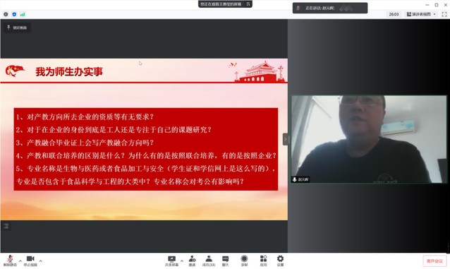 党支部有幸邀请到海燕论坛 党委委员赵元晖老师,解答前期支部收集的同学们关于产教融合培养方向的相关疑惑。赵元晖老师细致、全面地为21级产教方向所有的同学们解答关于“学校对产教融合方向所去实习企业资质的要求”和“对于在企业实习过程中科研方向的侧重点”等问题。