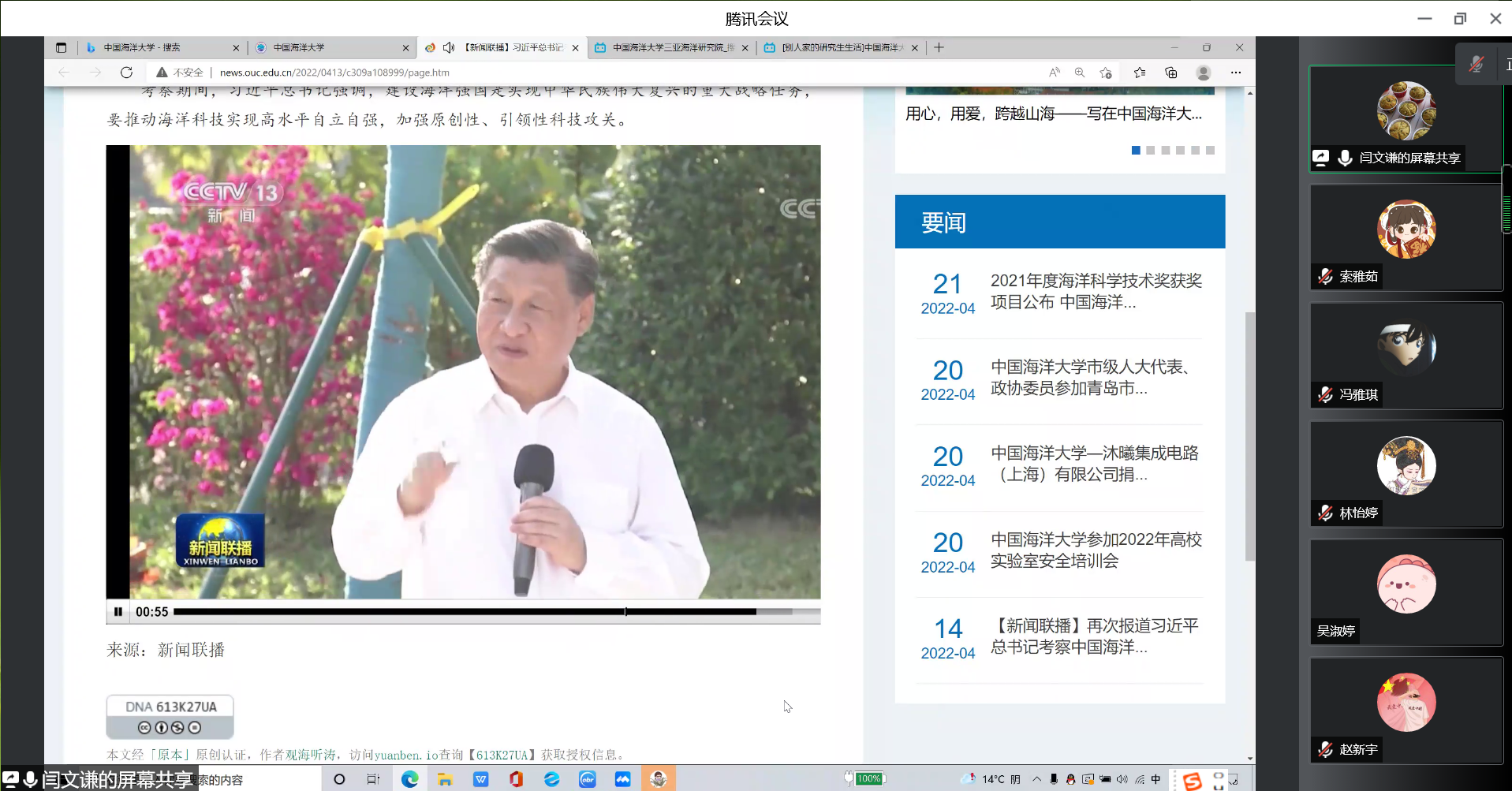 4月21日晚上8点30分,2020级食品科学与工程2班集体观看习近平考总书记考察中国海洋大学三亚海洋研究院时的重要讲话,深入学习习近平总书记在考察研究院时的重要讲话精神。新闻联播观看结束后,班级同学交流分享聆听总书记重要讲话的心得体会。