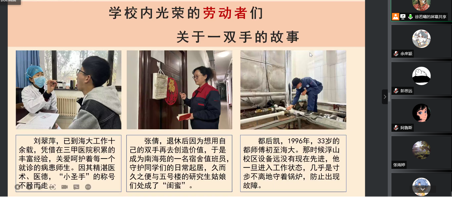 班会由央视新闻发布的视频“第一视角体验劳动者的世界”引入,带领同学们感受劳动之美,感悟劳动之于个人、社会和国家发展的重要意义。随后,班会向同学们介绍了海大园里的劳动者,专业贴心的医护人员、耐心负责宿管阿姨、严谨认真的设备师傅……,他们如同海大园里的螺丝钉,默默坚守在自己的岗位,用劳动的双手创造出不凡的价值。紧接着,吴淑婷从劳动的意义、方式、作用等方面分享了自己的劳动经历,呼吁同学们用实际行动响应劳动最光荣的口号。在分享结束后,班会对劳动周的系列活动进行了总结回顾。