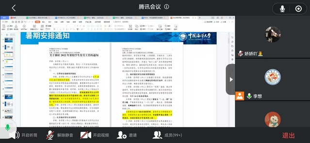 本站讯 为扎实做好学生暑假安全和疫情防控教育工作,进一步提高防护自救能力,6月16日,食品科学与工程海燕论坛 2020级硕士研究生年级大会在线上顺利举行,年级辅导员李想以及2020级全体硕士研究生参加了会议。