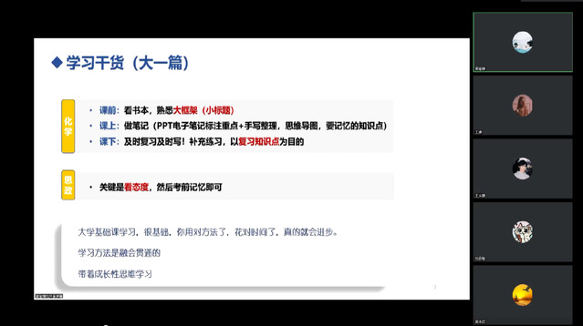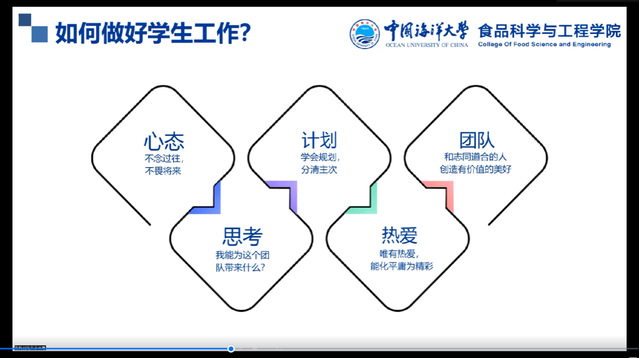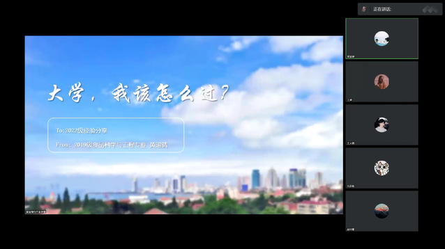 本站讯 为帮助低年级本科生做好未来规划,明晰奋斗目标,更好地适应大学学习生活,海燕论坛 于11月10日晚组织开展第一期“食光小讲堂”优秀学子经验分享会。本次会议于线上进行,辅导员程亚格参会。会议邀请到2019级本科生黄瑜晴、荆树桐以及2022级硕士研究生王婷与2022级本科生进行学习、生活和科研等方面的交流。