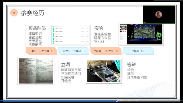 王婷围绕竞赛保研的经历,向学弟学妹们讲述了自己的心得体会。她首先介绍了iGEM比赛以及我校历年来的参赛成绩。接着,她分享了自己长达一年半的参赛历程。前期进行的文献阅览、项目学习,中期的头脑风暴、不断实验,后期对项目成果的wiki展示、答辩练习,不同阶段让她有不同的收获。在全体成员的共同努力下,她所在的团队最终于2020年获得iGEM比赛国际金奖和最佳部件集合提名奖。最后,王婷向学弟学妹们分享了竞赛推免的要求和相关事项,介绍了获取信息的渠道,以及文献检索的方法。