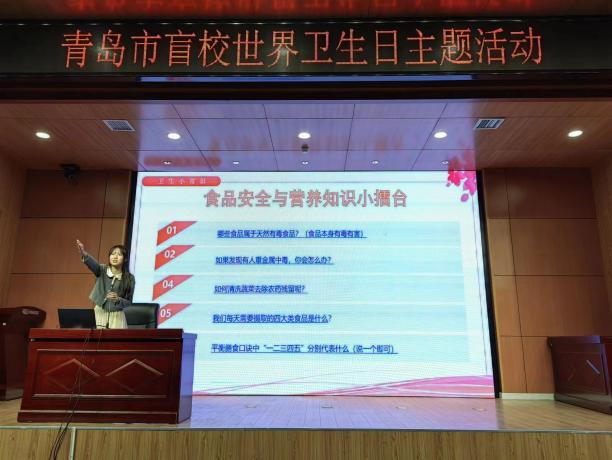 宣讲伊始,主讲人王柯力向青岛市盲校师生介绍了中国海洋大学“勉行”义工队和相关志愿服务项目。随后,她结合“世界卫生日”的由来、生活中的卫生常识及中国居民膳食指南(2022) 为同学们进行食育科普。在互动环节中多名同学积极回答问题,准确地复述了主讲人讲授的知识点,现场氛围热烈。