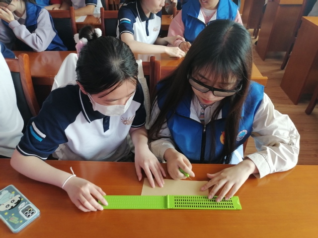 10.志愿者在盲校学生的帮助下体验盲文学习和手工制作