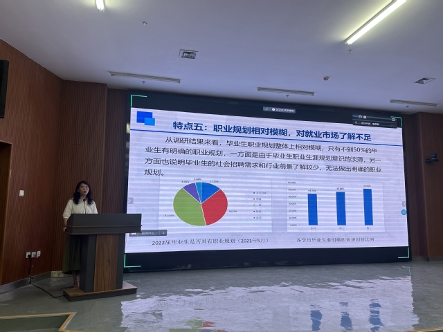会议伊始,学校就业创业指导与服务中心王圣丹老师首先介绍了当前大学生整体就业形势,以及我校毕业生就业的基本情况,重点有五个方面特点,一是毕业去向落实率整体稳定,签约就业为主要去向;二是公职单位就业增长明显,“考公热”持续升温;三是就业区域省内为主,中西部增长潜力大;四是毕业生择业影响因素更加宽泛,更加注重工作“体验”;五是职业规划相对模糊,对就业市场了解不足。最后,她鼓励2024届硕士毕业生需紧跟社会需求,提前做好职业规划,提高就业主动性;积极利用周边资源、就业指导活动等获取就业信息,提升就业技巧;不断提高自身实习实践能力、创新创造能力和人际沟通能力。