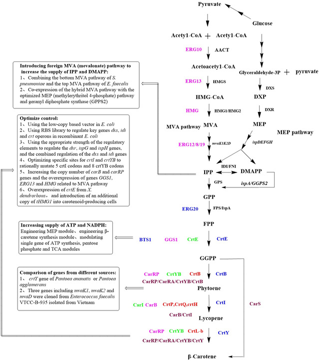 β-胡萝卜素,一种常见于植物、真菌和藻类的类胡萝卜素,也是一种稳定的天然色素。β-胡萝卜素在人体内可转化为维生素A,并发挥抗氧化性、抗癌活性和抗心血管特性,因此被广泛应用于食品、医药和营养行业。迄今为止,天然β-胡萝卜素主要是从天然积累β-胡萝卜素的植物、藻类和微生物中提取,其天然浓度很低,因此导致成本高昂。随着对β-胡萝卜素合成途径研究的深入,代谢工程在提高β-胡萝卜素产量方面发挥了重要作用,为其生产提供了另一条途径。