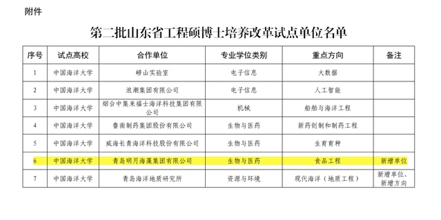 本站讯 近日,中共山东省委组织部、山东省教育厅等9部门联合公布了第二批山东省工程硕博士培养改革试点单位名单。中国海洋大学与青岛明月海藻集团联合申报的食品工程重点方向成功入选。