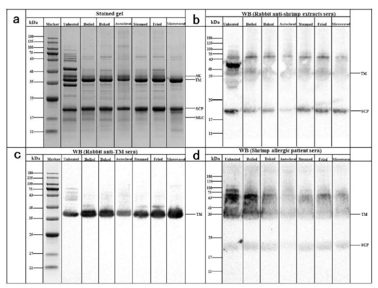 Fig. 1. SDS-PAGE reducing gel of raw and different heat-treated shrimp soluble extracts (a), and IgG immunoblots with pooled rabbit antisera against raw shrimp extracts (b) and TM (c) and IgE immunoblots with pooled shrimp allergic patients’ sera (d).