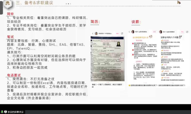 2022届毕业生杭天,2023届毕业生陆泽伟、吴虹艳、张天宇和李斐结合自己的求职经历和职场感悟,分别从求职、申博和考公三个方面分享了他们的经验与心得,激励2025届毕业生充分准备,勇面困难,积极尝试。