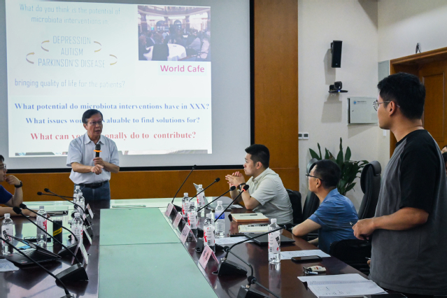 在本次报告中,蔡英杰介绍了益生菌保健功能的演进历程、以肠脑轴为核心的益生菌作用机制,并详细介绍了益生菌在抑郁症、自闭症、肌少症等疾病中的重要研究进展与最新成果。他聚焦益生菌在缓解自闭症方面的潜能,突破了传统治疗方法的局限,启发了大家对微生物与心理健康关系的思考,提高了同学们对益生菌在心理干预中的应用潜力的认识。