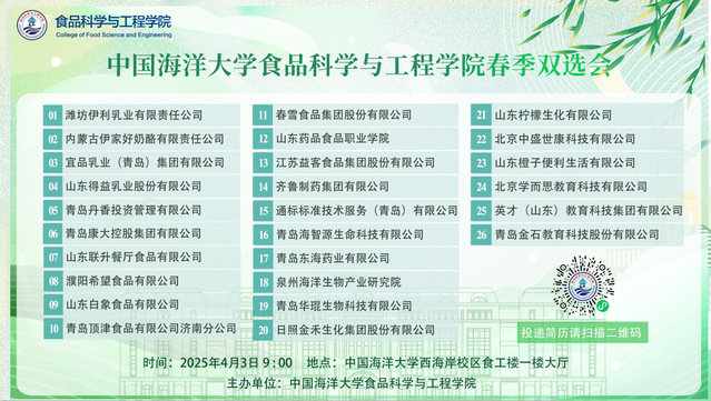 本次双选会采用线下双选+线上云聘+现场直播的立体招聘模式。线下会场设在中国海洋大学西海岸校区,25家企业齐聚食品海燕论坛 ,涵盖食品制造、乳品研发、生物科技、高等教育、培训等多个领域,提供就业岗位200余个、实习岗位50余个。毕业生们手持简历穿梭于各企业展位前,与企业招聘负责人深入交流。不少非毕业年级的同学也参与其中,以期更好了解就业市场和岗位要求,提前为未来的的毕业求职做好职业规划。