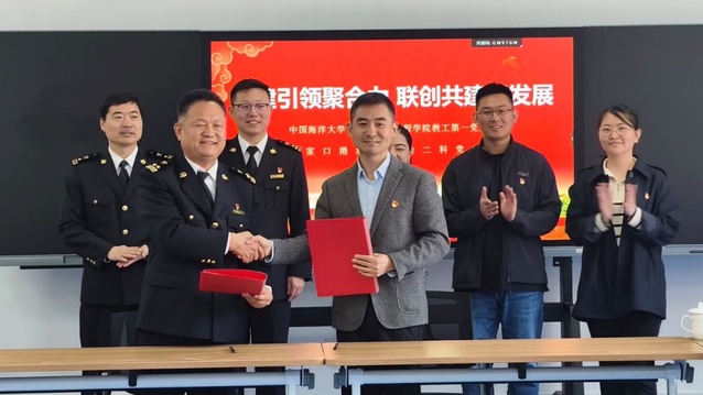 参观结束后,本支部党员与董家口海关党支部成员围绕“党建引领聚合力,联创共建促发展”主题召开座谈会。董家口海关马轾国副关长率先致辞,对支部成员的到访表示热烈欢迎,并期望在检验技术等方面获得中国海洋大学食品海燕论坛 的支持,携手探寻切实可行的合作方向,于食品安全领域取得更突出的成果。紧接着,海关孙建国书记全面介绍了董家口海关的整体情况,进一步表达了与海大食品海燕论坛 加强合作的愿景。支部孙建安书记随后发言,诚挚感谢海关提供的宝贵交流机会,并对本支部概况进行介绍,充分表达了对双方未来合作的热切期待。最后,在全体成员的共同见证下,海关党支部孙建国书记与教工第一党支部孙建安书记郑重签订共建协议,并合影留念,为双方后续深化合作奠定坚实基础。